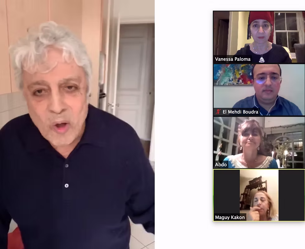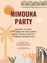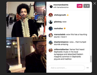 Chama Mechtaly, a Moroccan visual artist that lives in Dubai hosted a Virtual Mimouna on Instagram live with a Gnawa musician in Essaouira and a Jazz Trumpeter in Brooklyn on April 18. Here the central aspect was the dialogue between a Muslim and a Jewish musician and the shared improvisation of Jazz and Gnawa musical traditions. Unfortunately, because of the time lag due to being in different time zones, they were not able to play together, but discussed their previous collaborations and each played solo then commenting on each other’s playing. There was an active chat going with questions from the attendees, which were close to 30 at its height. The Mimouna ended abruptly, as Instagram automatically cut it off at the 60-minute mark while he was playing the Jewish Gnawa song on Baba Musa. Appropriate.